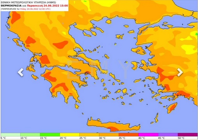 - Την Παρασκευή (24-06-2022) και το Σάββατο (25-06-2022) η θερμοκρασία θα πέσει κατά 2 με 3 βαθμούς και η μέγιστη τιμή θα φθάσει στα κεντρικά και τα νότια τους 37 με 38 βαθμούς, ενώ στα βόρεια δεν θα ξεπεράσει τους 34 με 35 βαθμούς Κελσίου.