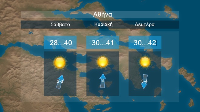Στην Αθήνα προβλέπεται σχεδόν αίθριος καιρός Η θερμοκρασία θα έχει μέγιστες τιμές περί τους 40 με 42 βαθμούς Κελσίου.