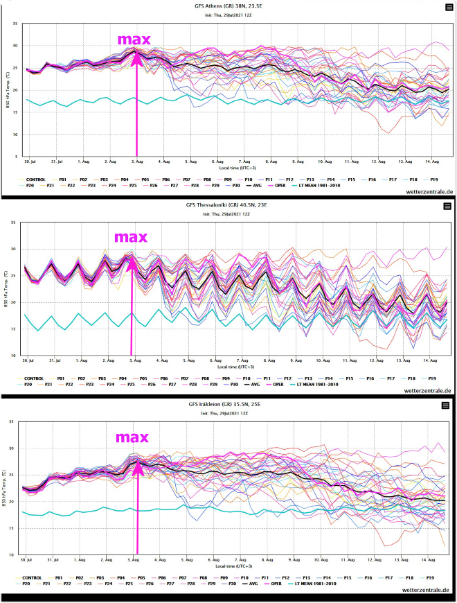 Στην Αθήνα, τη Θεσσαλονίκη και το Ηράκλειο οι υψηλότερες τιμές στην στάθμη των 850 hPa θα παρουσιαστούν την Τρίτη ενώ ο ρυθμός πτώσης σε κάθε περιοχή είναι διαφορετικός.