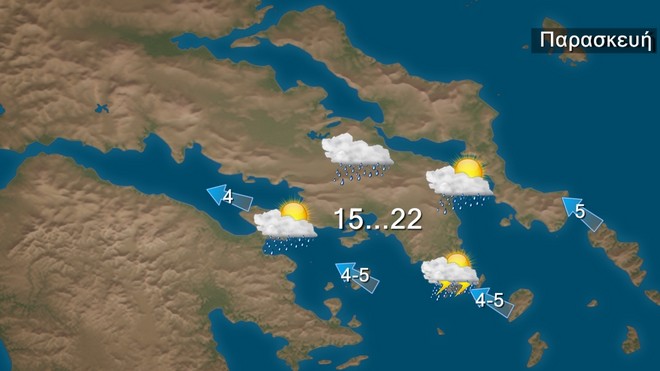 Στη νοτιοανατολική νησιωτική χώρα προβλέπονται λίγες νεφώσεις που από το απόγευμα θα αυξηθούν και είναι πιθανό να σημειωθούν τοπικές βροχές. Στις υπόλοιπες περιοχές προβλέπονται νεφώσεις με βροχές και καταιγίδες κατά τόπους ισχυρές στο Ιόνιο, τα ηπειρωτικά, την Εύβοια, τις Σποράδες, τις δυτικές-βόρειες Κυκλάδες και από το μεσημέρι στα νησιά του βορειοανατολικού Αιγαίου. Σταδιακά τα φαινόμενα θα εξασθενήσουν στην Πελοπόννησο, τη Στερεά, την Εύβοια και τις Κυκλάδες. Οι άνεμοι θα πνέουν, στα βόρεια ανατολικοί βορειοανατολικοί 5 με 6 και τοπικά στο βόρειο Αιγαίο 7 μποφόρ. Στα υπόλοιπα από νότιες διευθύνσεις 4 με 6 Η θερμοκρασία στα βόρεια θα φτάσει τους 20 βαθμούς, και στις υπόλοιπες περιοχές τους 24 με 27 βαθμούς Κελσίου