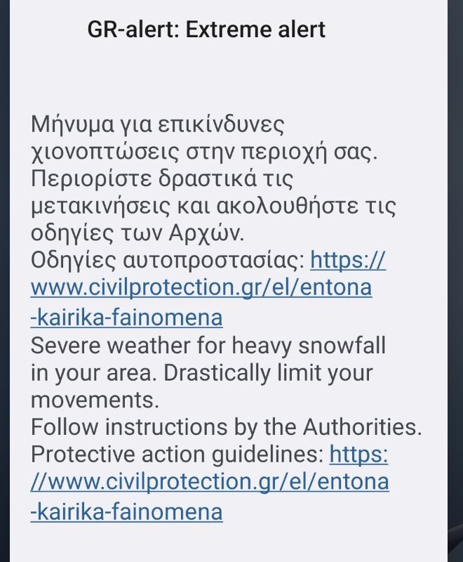 “Μήνυμα για επικίνδυνες χιονοπτώσεις στην περιοχή σας. Περιορίστε δραστικά τις μετακινήσεις και ακολουθήστε τις οδηγίες των Αρχών” έγραφε συγκεκριμένα το μήνυμα που έλαβαν στα κινητά τους τηλέφωνα κάτοικοι της Αθήνας.
