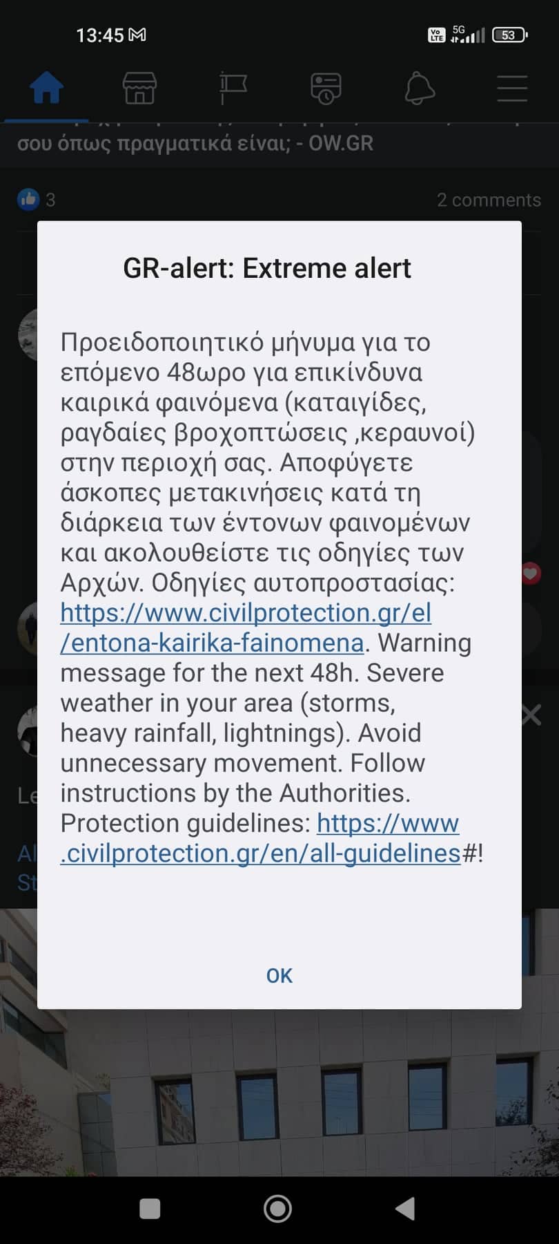 “Προειδοποιητικό μήνυμα για το επόμενο 48ωρο για επικίνδυνα καιρικά φαινόμενα (καταιγίδες, ραγδαίες βροχοπτώσεις, κεραυνοί) στην περιοχή σας. Αποφύγετε άσκοπες μετακινήσεις κατά τη διάρκεια των έντονων φαινομένων και ακολουθήστε τις οδηγίες των αρχών“, αναφέρει το μήνυμα.