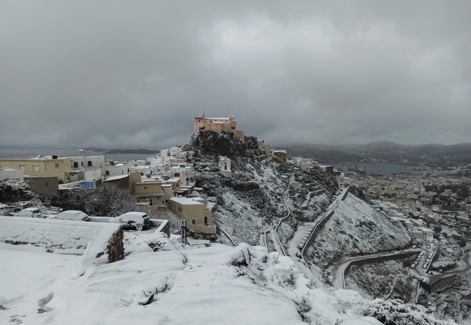 Χιόνια στη Σύρο ΜΑΙΡΗ ΚΑΡΑΒΑ/EUROKINISSI