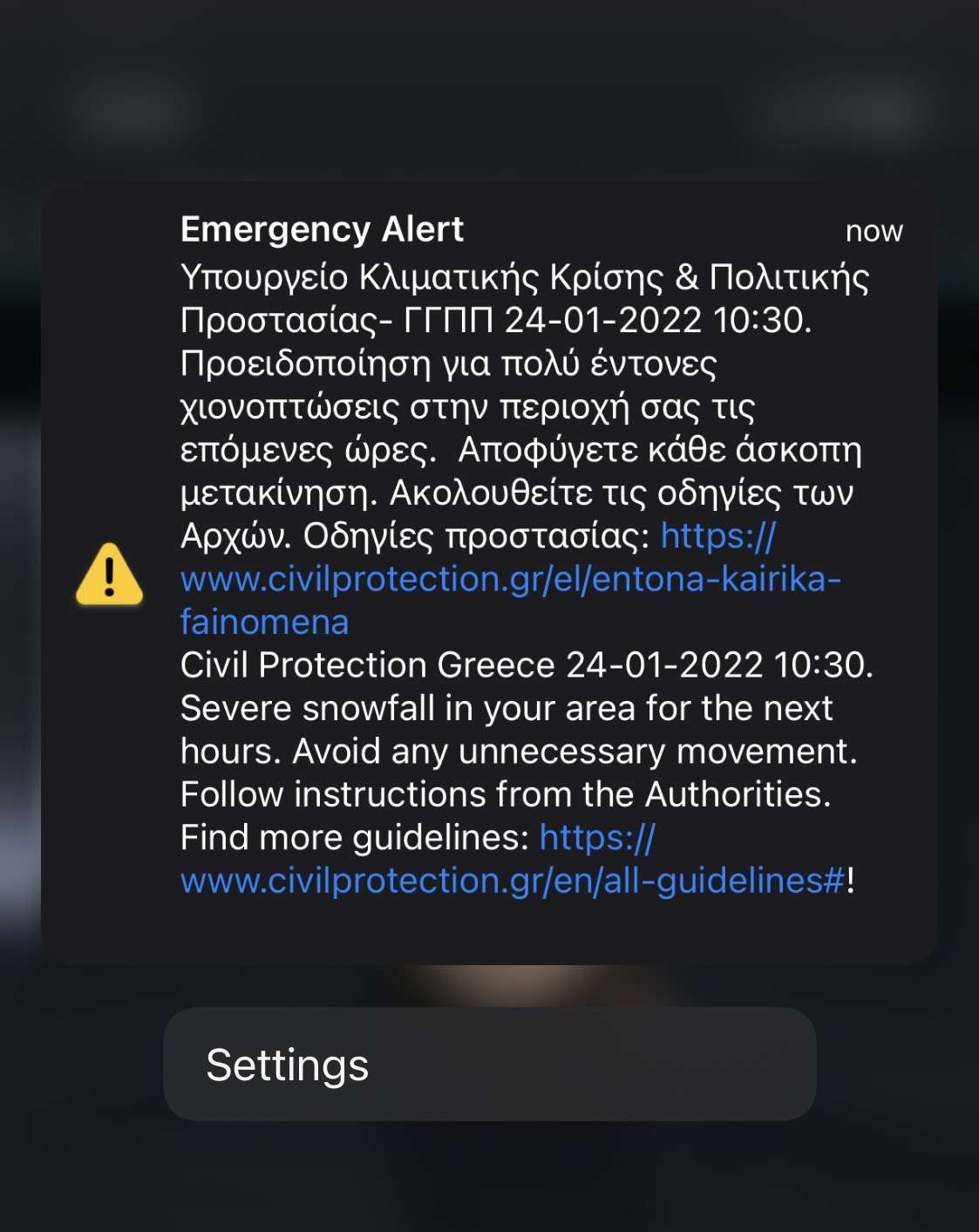 Συγκεκριμένα το μήνυμα αναφέρει: “Προειδοποίηση για πολύ έντονες χιονοπτώσεις στην περιοχή σας τις επόμενες ώρες. Αποφύγετε κάθε άσκοπη μετακίνηση. Ακολουθείτε τις οδηγίες των αρχών“.