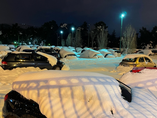 Τα οχήματα όσων είχαν μπει στο πάρκινγκ του νοσοκομείου Γεννηματάς το πρωί της Δευτέρας είναι ακόμη πλήρως αποκλεισμένα. Το πάρκινγκ είναι θαμμένο στο χιόνι καθιστώντας αδύνατο για τους οδηγούς να μετακινήσουν τα αυτοκίνητα τους.