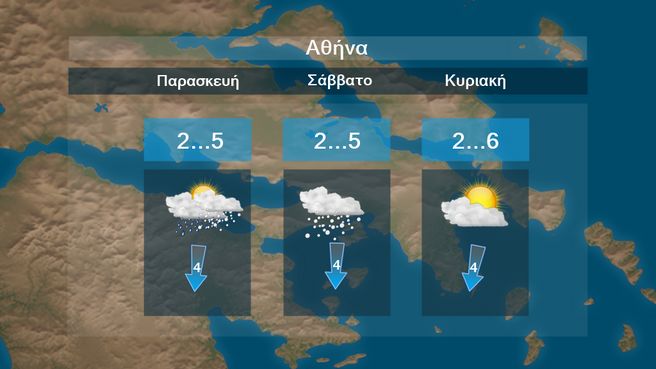 Στην Αθήνα προβλέπονται βροχές ή χιονόνερο και στα ορεινά και ημιορεινά χιόνια τοπικά και σε χαμηλότερα υψόμετρα. Η θερμοκρασία δεν θα ξεπεράσει τους 5 με 6 βαθμούς Κελσίου