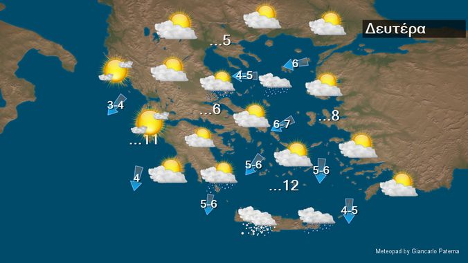 Στα ανατολικά ηπειρωτικά, τις Κυκλάδες και την Κρήτη προβλέπονται νεφώσεις με ασθενείς βροχές ή χιονόνερο και λίγα χιόνια στα ορεινά με σταδιακή βελτίωση. Στην υπόλοιπη χώρα αίθριος καιρός με πρόσκαιρες τοπικές νεφώσεις. Οι άνεμοι θα πνέουν από βόρειες διευθύνσεις 3 με 5 μποφόρ και στο Αιγαίο τοπικά 6 μποφόρ. Η θερμοκρασία θα σημειώσει άνοδο κυρίως την Τρίτη. Παγετός θα σημειωθεί στα ηπειρωτικά τις πρωινές και βραδινές ώρες, ο οποίος θα είναι κατά τόπους ισχυρός στα κεντρικά και βόρεια.