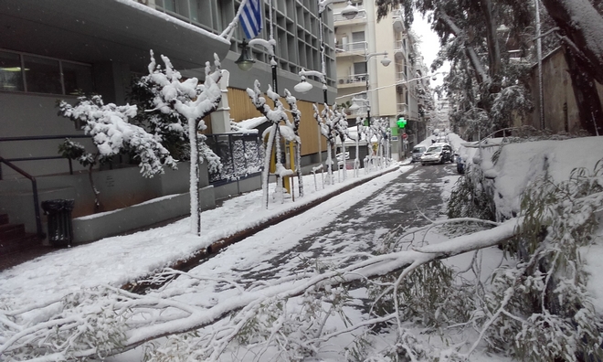 Κακοκαιρία Μήδεια: Εκχιονιστικό στο Κολωνάκι και πτώση δέντρων στον Ευαγγελισμό