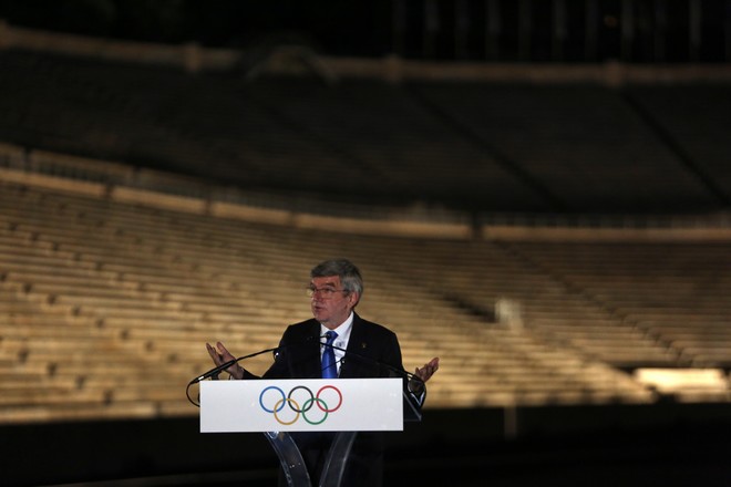 Στην εκδήλωση για τη φωταγώγηση του μνημείου βρέθηκε ο πρόεδρος της Διεθνούς Ολυμπιακής Επιτροπής, Τόμας Μπαχ ο οποίος επισκέπτεται τη χώρα μας. Τα εγκαίνια έγιναν παρουσία της προέδρου της Δημοκρατίας Κατερίνας Σακελλαροπούλου, της υπουργού Πολιτισμού Λίνας Μενδώνη, του υφυπουργού Αθλητισμού Λευτέρη Αυγενάκη, του δημάρχου Αθηναίων Κώστα Μπακογιάννη και του προέδρου της Ελληνικής Ολυμπιακής Επιτροπής Σπύρου Καπράλου.