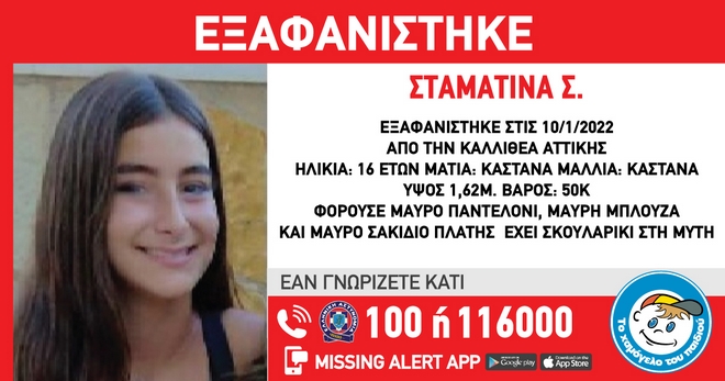 Η 16χρονης εξαφανίστηκε από την Καλλιθέα το πρωί της περασμένης Δευτέρας, 10 Ιανουαρίου.Οποιοσδήποτε έχει κάποια πληροφορία, παρακαλείται να επικοινωνήσει τηλεφωνικά με "Το Χαμόγελο του Παιδιού".