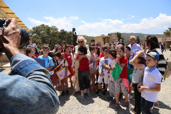Κατά τη διάρκεια της επίσκεψης, παιδιά προσέφεραν στην Καμίλα ζωγραφιές με μινωικές απεικονίσεις.