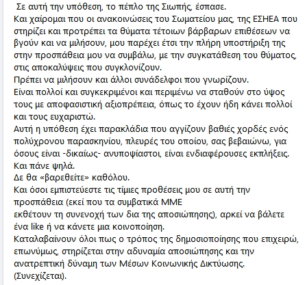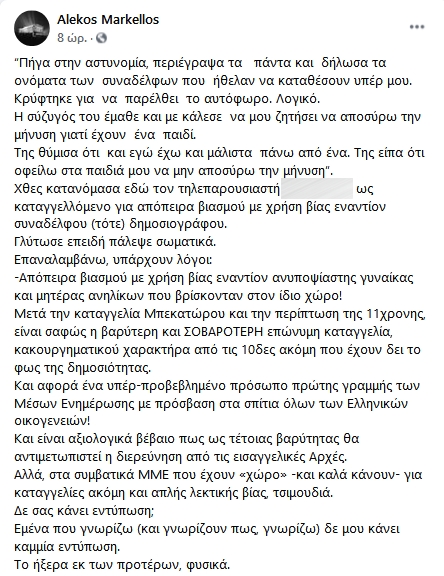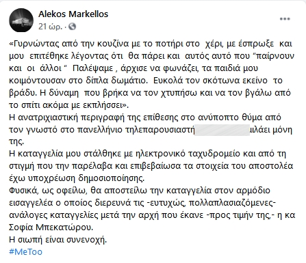 “Χθες κατονόμασα εδώ τον τηλεπαρουσιαστή ως καταγγελλόμενο για απόπειρα βιασμού με χρήση βίας εναντίον συναδέλφου (τότε) δημοσιογράφου. Γλύτωσε επειδή πάλεψε σωματικά. Επαναλαμβάνω, υπάρχουν λόγοι: Απόπειρα βιασμού με χρήση βίας εναντίον ανυποψίαστης γυναίκας και μητέρας ανηλίκων που βρίσκονταν στον ίδιο χώρο!”, έγραψε χαρακτηριστικά ο δημοσιογράφος.