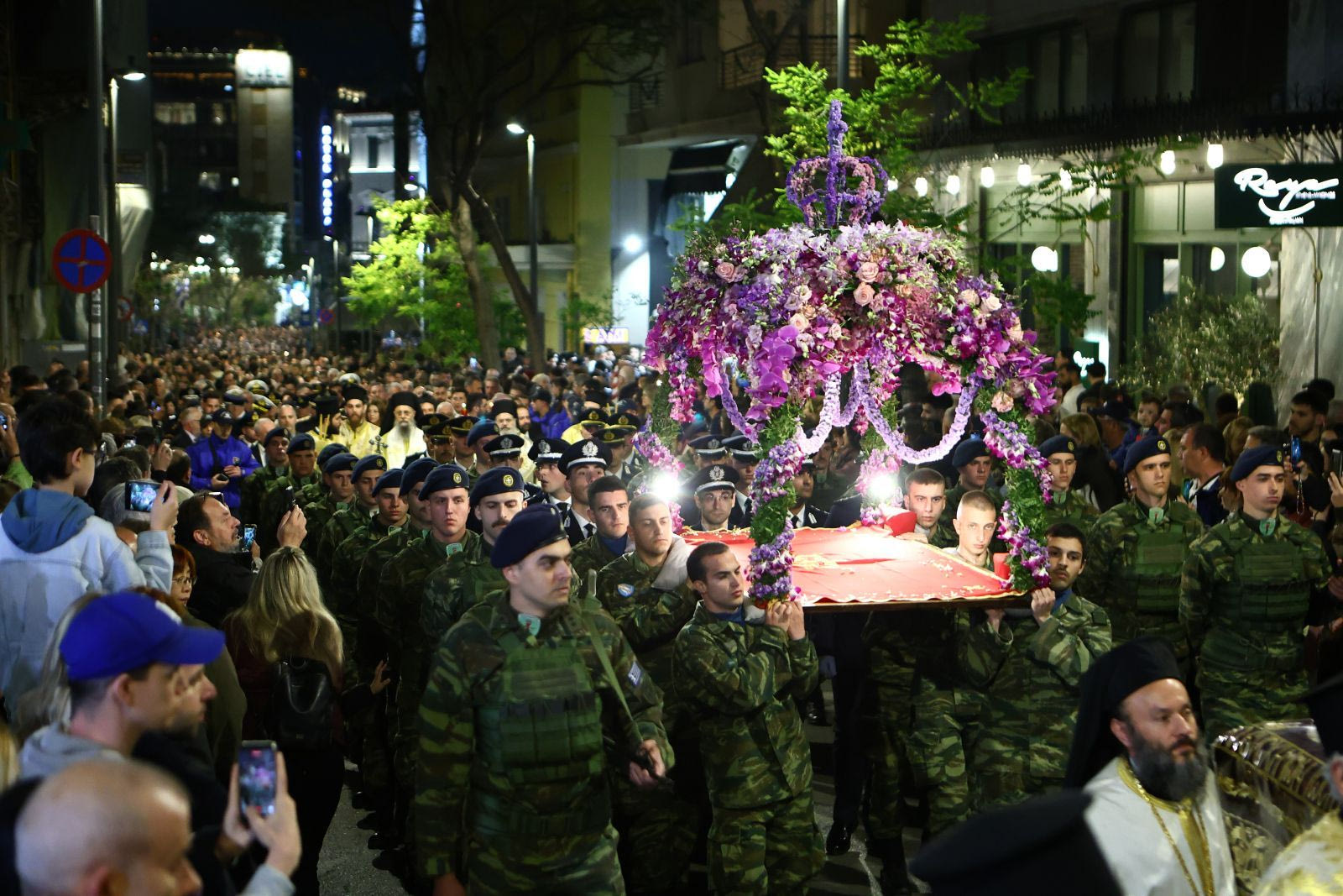 Ακολούθησε η περιφορά του Επιταφίου, με τη συνοδεία αγημάτων των Σωμάτων Ασφαλείας και των Ενόπλων Δυνάμεων που απέτισαν τιμές, αλλά και πλήθους πιστών με αναμμένα κεριά στα χέρια. Η πορεία από την οδό Μητροπόλεως κατέληξε στην Πλατεία Συντάγματος μπροστά από το Μνημείο του ‘Αγνωστου Στρατιώτη, όπου είχε στηθεί εξέδρα, πάνω στην οποία χοροστατούντος του Αρχιεπισκόπου Ιερωνύμου τελέστηκε δέηση υπέρ των πεσόντων του έθνους.