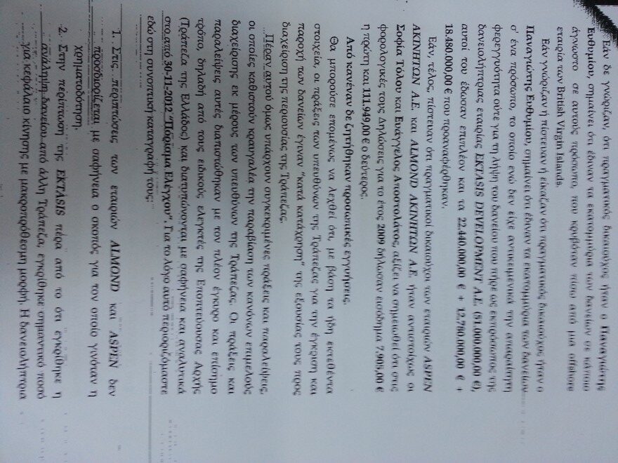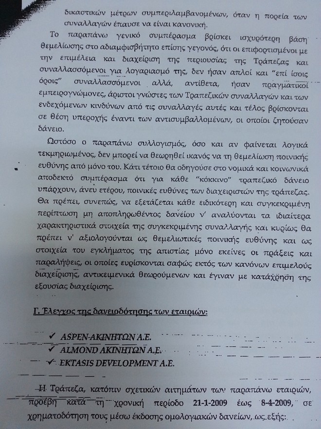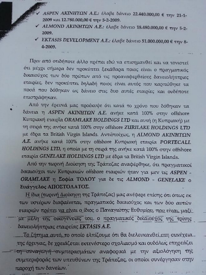 Στο εισαγγελικό πόρισμα αναφέρεται ότι η εταιρεία ASPEN έλαβε δυο δάνεια, το πρώτο 22,4 εκατ. ευρώ και το δεύτερο 12,78 εκατ., η ALMOND 18,48 και η EKTASIS 51 εκατ. ευρώ.