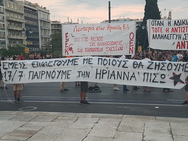 Στην πλατεία Συντάγματος, αλλά και μπροστά στο κτίριο της Βουλής βρέθηκε το απόγευμα της Παρασκευής πλήθος κόσμου για να εκφράσει την συμπαράστασή του στην Ηριάννα Β.Λ. και να εκφράσει την αντίθεσή του στην ποινή φυλάκισης που της επιβλήθηκε πρωτόδικα.