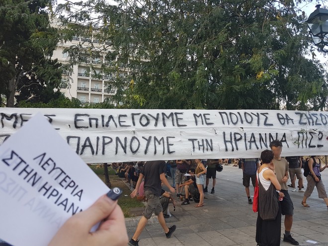 Τα πανό που άπλωσαν στην πλατεία Συντάγματος οι συγκεντρωμένοι, γράφουν “Εμείς επιλέγουμε με ποιούς θα ζήσουμε, στις 17/7 παίρνουμε την Ηριάννα πίσω” ενώ υπάρχει αναρτημένο πανό και στα αγγλικά. Παράλληλα στους συγκεντρωμένους μοιράστηκαν ενημερωτικά φυλλάδια, ενώ από μικροφωνική επαναλαμβανόταν το ιστορικό της καταδίκης της 29χρονης.