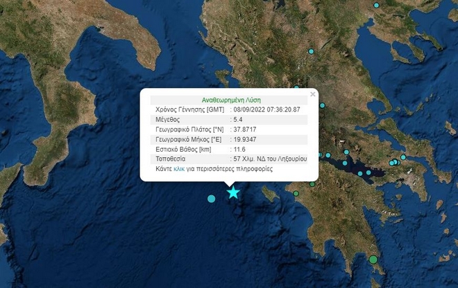 Ισχυρός σεισμός 5,4 Ρίχτερ σημειώθηκε λίγο μετά τις 10.30 το πρωί ανοιχτά της Κεφαλονιάς. Ιδιαίτερα αισθητός σε Ζάκυνθο και Λευκάδα. Έκλεισε η παραλία "Ναυάγιο".