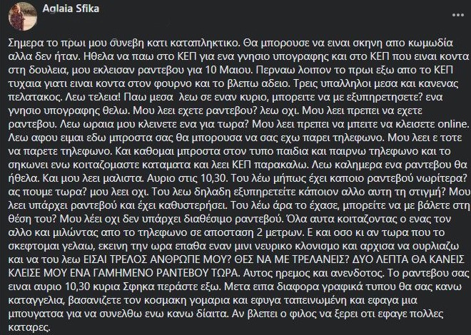 “Παίρνω τηλέφωνο και το σηκώνει ενώ κοιταζόμαστε κατάματα και λέει ΚΕΠ παρακαλώ.. Λέω καλημέρα, ένα ραντεβού θα ήθελα. Και μου λέει μάλιστα. Αύριο στις 10,30. Του λέω μήπως έχει κάποιο ραντεβού νωρίτερα; Ας πούμε τώρα; Μου λέει όχι. Του λέω, δηλαδή εξυπηρετείτε κάποιον άλλον αυτή τη στιγμή; Μου λέει υπάρχει ραντεβού και έχει καθυστερήσει. Του λέω άρα το έχασε, μπορείτε να με βάλετε στη θέση τους; Μου λέει όχι δεν υπάρχει διαθέσιμο ραντεβού. Όλα αυτά κοιτάζοντας ο ένας τον άλλον και μιλώντας από το τηλέφωνο σε απόσταση 2 μέτρων”, αναφέρει μεταξύ άλλων η ανάρτησή της, την οποία μπορείτε να διαβάσετε ολόκληρη ακολούθως: