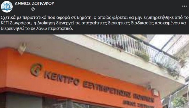 Λίγες ώρες αργότερα πάντως, ο Δήμος Ζωγράφου ενημέρωσε μέσω ανάρτησής του στο Facbbok πως διενεργεί τις απαραίτητες διοικητικές διαδικασίες προκειμένου να διερευνηθεί το εν λόγω περιστατικό.