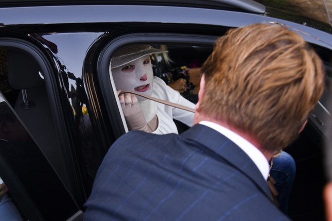 Φορώντας την ειδική μάσκα και ένα μαντήλι στα μαλλιά, η Ιωάννα Παλιοσπύρου, θύμα της άγριας επίθεσης με το βιτριόλι, κάθισε στην πρώτη σειρά του ακροατηρίου για να παρακολουθήσει τη διαδικασία.