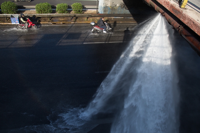 Δύο ώρες σχεδόν μετά η ροή του νερού από τον αγωγό έχει σταματήσει, ωστόσο τα προβλήματα στην κίνηση παραμένουν.