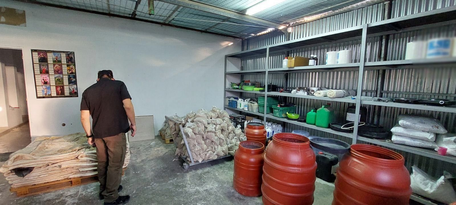 Η αποθήκη-εργαστήριο εντοπίστηκε στα Σπάτα με 25 παλέτες με δέρματα εμποτισμένα σε κοκαΐνη. Το βάρος των δερμάτων υπολογίζεται περίπου στους 20 τόνους.