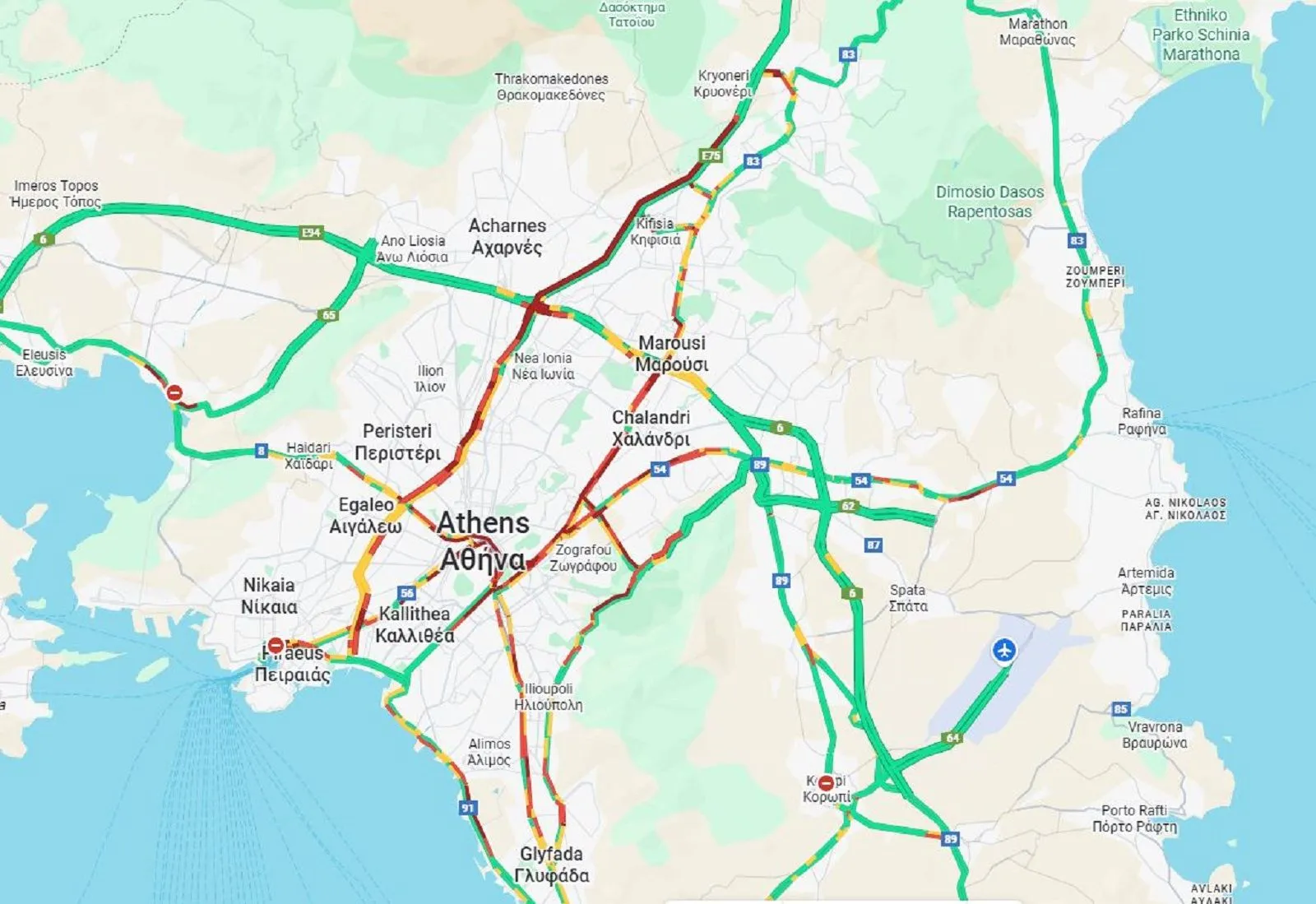 Στο “κόκκινο” πολλές κεντρικές οδικές αρτηρίες στην Αθήνα. Πού εντοπίζονται τα μεγαλύτερα προβλήματα.