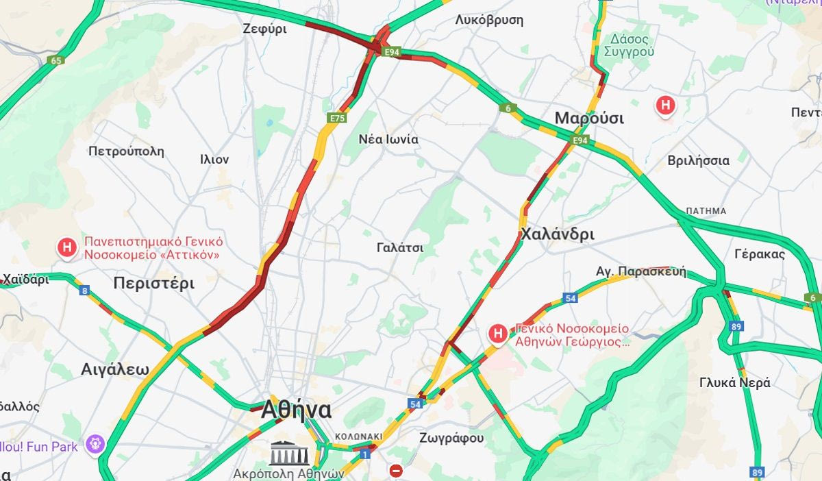 Στο “κόκκινο” είναι από νωρίς το πρωί η Λεωφόρος Κηφισίας και στα δύο ρεύματα, ενώ καθυστερήσεις θα συναντήσουν όσοι οδηγοί κινούνται στην Αλεξάνδρας, τη Μεσογείων, την άνοδο της Βασ. Σοφίας, την άνοδο της Λεωφόρου Συγγρού, τη Λεωφόρο Ποσειδώνος από την Αλίμου έως Καραϊσκάκη στο ρεύμα προς Πειραιά και τη Βάρης – Κορωπίου.