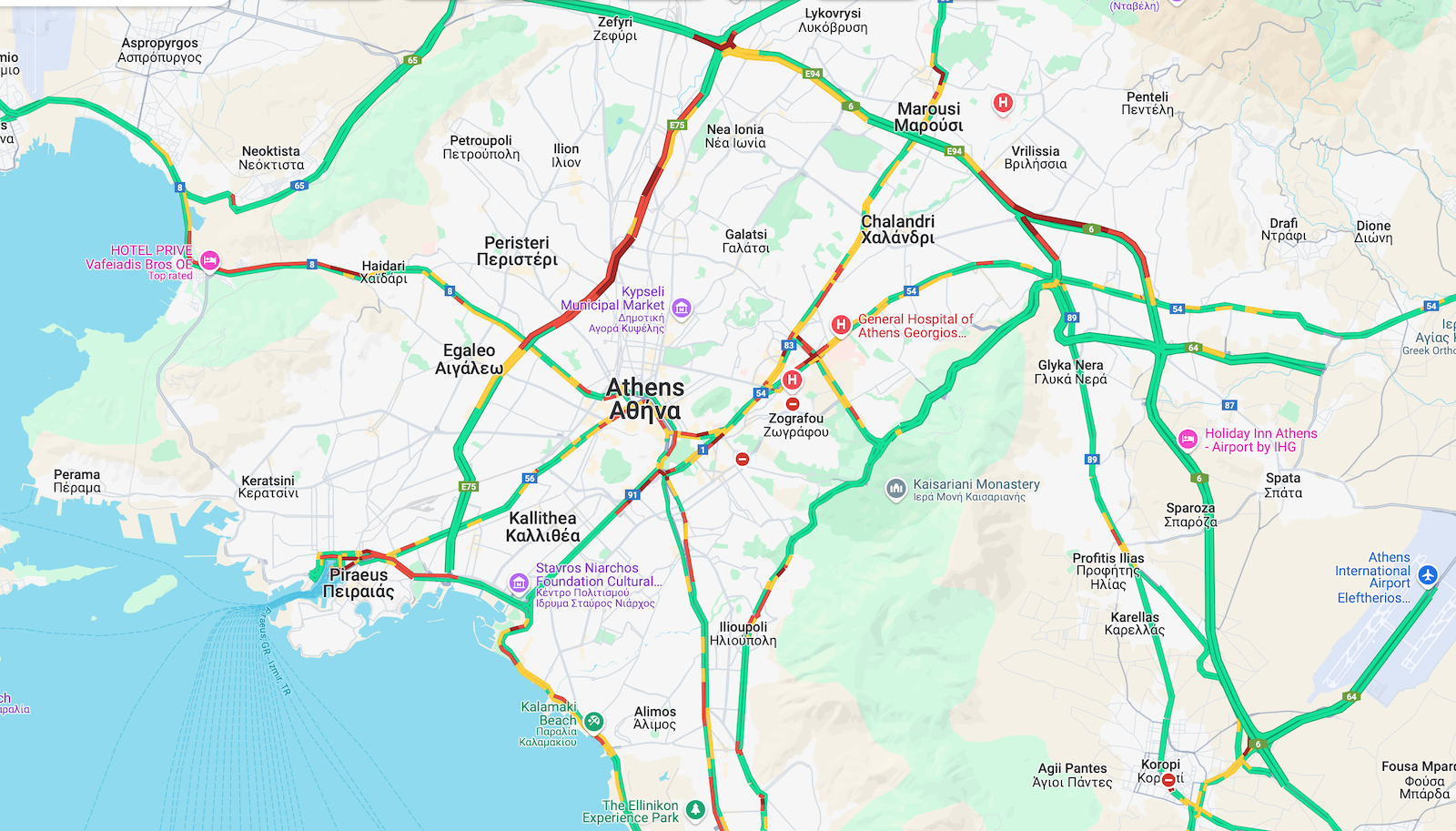 Ειδικότερα, ο Κηφισός είναι στο “κόκκινο”, με καθυστερήσεις να σημειώνονται από από το ύψος των ΚΤΕΛ έως και τη Νέα Φιλαδέλφεια.