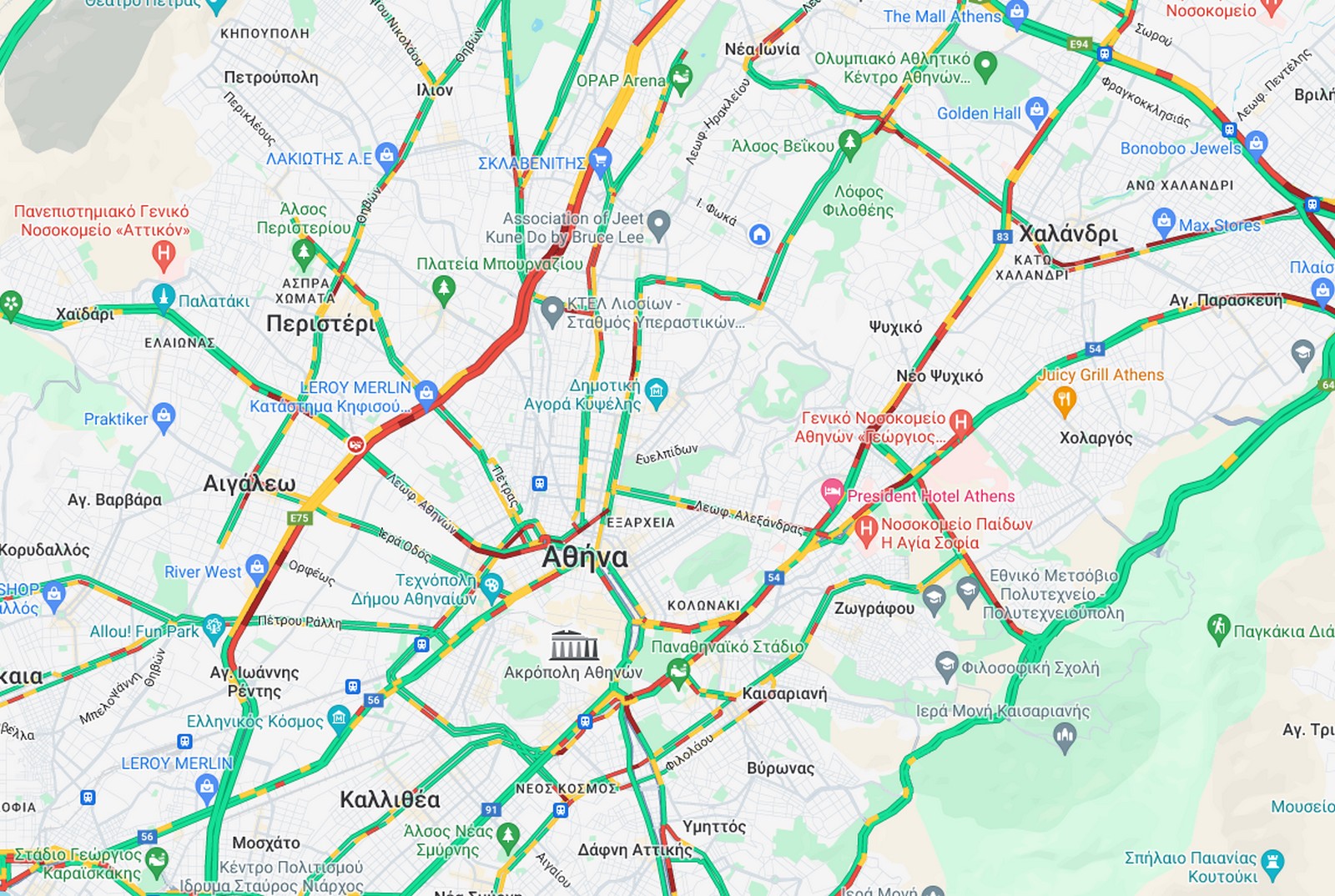 Πυκνή ροή οχημάτων παρατηρείται και στη Λεωφόρο Κηφισίας, ενώ μεγάλη συμφόρηση υπάρχει στη Μεσογείων.
