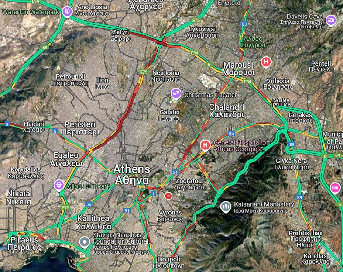 Παράλληλα, “στο κόκκινο” είναι και η Λ. Κηφισίας και στα δύο ρεύματα, η άνοδος της Βασ. Σοφίας, η Καλλιρόης, η Λ. Αλεξάνδρας, η Λ. Μεσογείων και η Βασ. Αμαλίας.