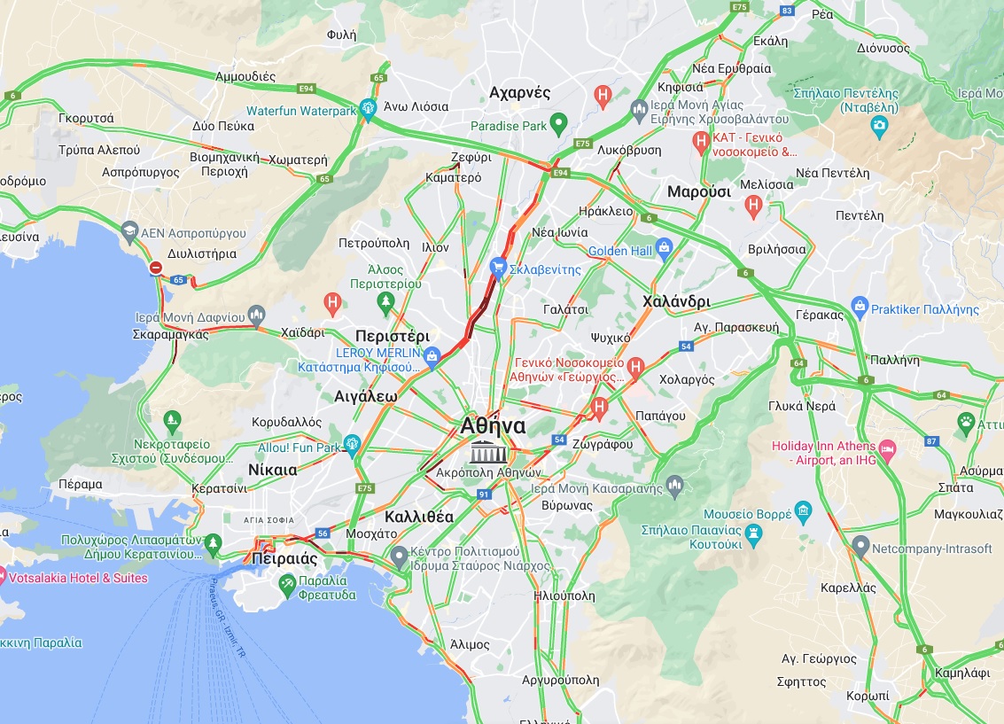 Στο “κόκκινο” είναι για μια ακόμη φορά ο Κηφισός και στα δύο ρεύματα, ενώ προβλήματα εντοπίζονται και στον Πειραιά, στη Μικράς Ασίας καθώς και στους δρόμους γύρω από το λιμάνι.