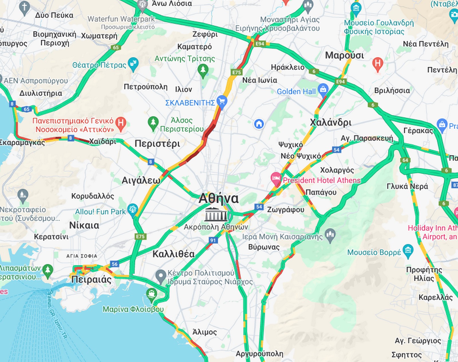Χαμηλές ταχύτητες επικρατούν και στα δύο ρεύματα του Κηφισού, όπως και στη Λεωφόρο Αθηνών.