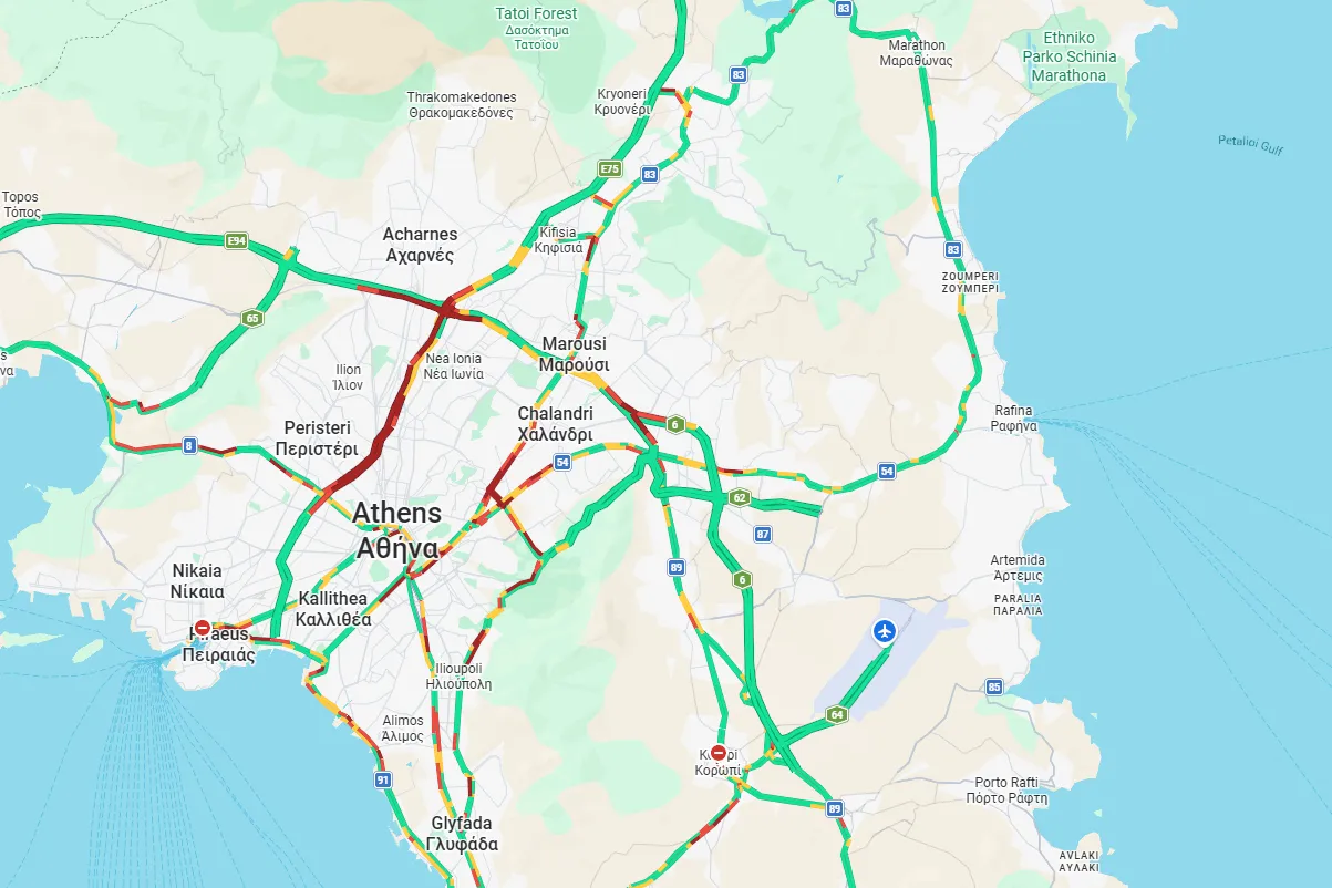 Κίνηση στους δρόμους: Kόκκινος ο Κηφισός, καθυστερήσεις 30′ προς αεροδρόμιο – LIVE ΧΑΡΤΗΣ