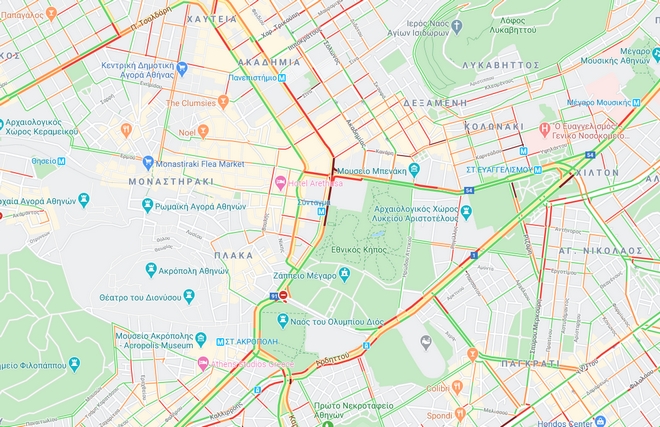 Παράλληλα, στο “κόκκινο” είναι η Λεωφόρος Βασιλέως Κωνσταντίνου, η Αρδηττού, η Καλλιρόης και η Αμροσίου Φραντζή, ενώ οι οδηγοί συναντούν προβλήματα και στη Φιλολάου στο Παγκράτι.