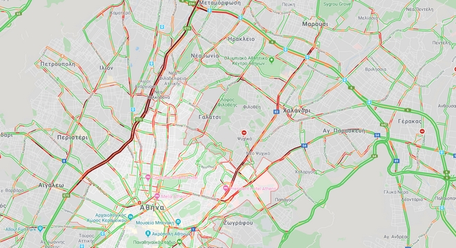 Πολύ αυξημένη κίνηση επίση στη λεωφόρο Κηφισίας και στα δύο ρεύματα, ενώ προβλήματα υπάρχουν και στην κάθοδο της Μεσογείων.