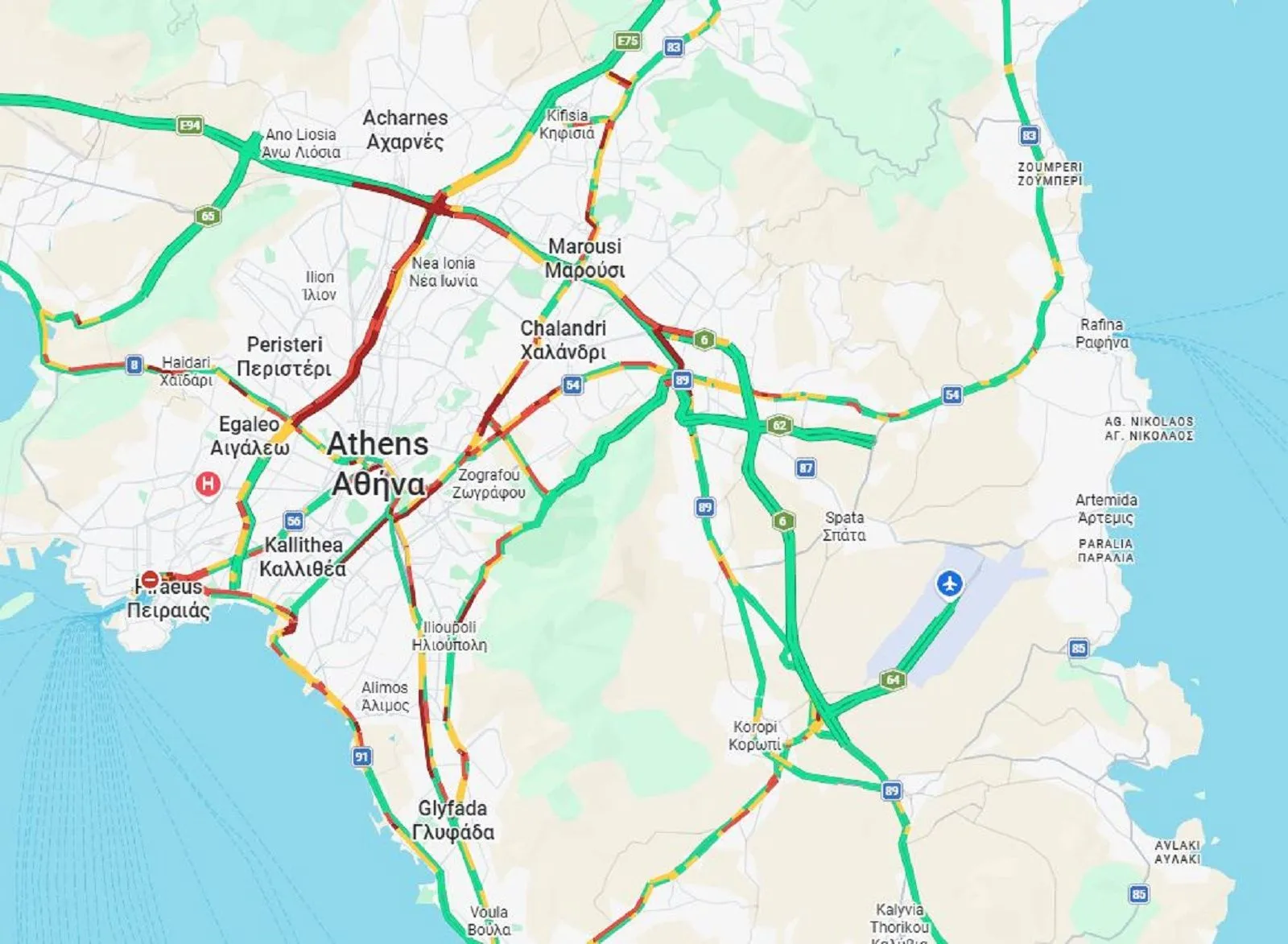 Σημαντικές καθυστερήσεις σε πολλές κεντρικές οδικές αρτηρίες της Αττικής. Πού εντοπίζονται τα μεγαλύτερα προβλήματα.