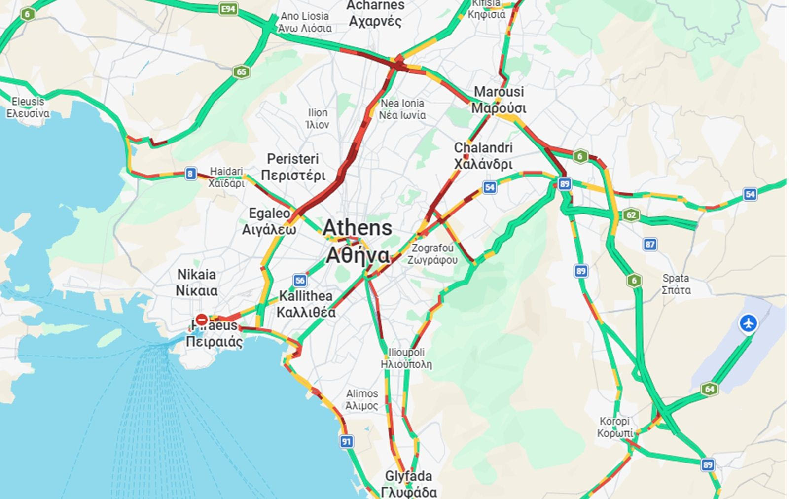 Με χαμηλές ταχύτητες κινούνται και οι οδηγοί στην Λεωφόρο Αθηνών από το Χαϊδάρι έως τον Σκαραμαγκά. Καθυστερήσεις παρατηρούνται και στη Μεσογείων, κυρίως κοντά στους βασικούς κόμβους.