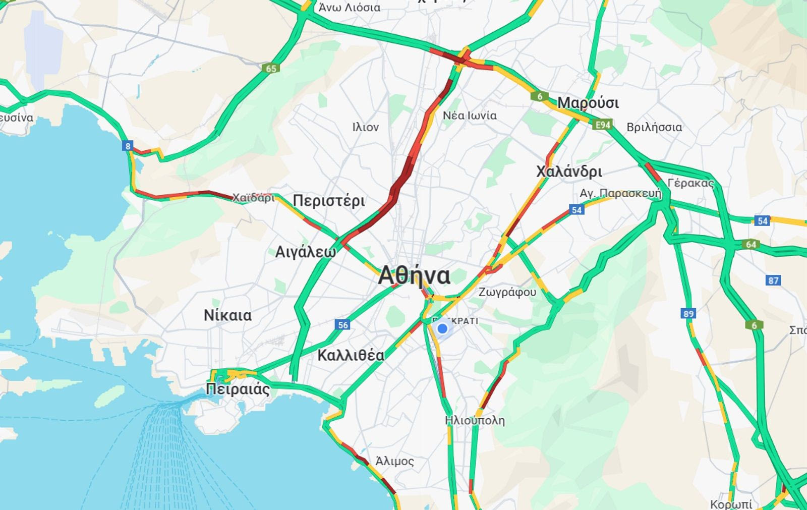 “Κολλημένη” είναι η άνοδος της Λεωφόρου Κηφισίας αλλά και τμήματα της καθόδου, όπως και η κάθοδος της Λεωφόρου Μεσογείων. Αυξημένη είναι επίσης η κίνηση στη Λεωφόρο Ποσειδώνος, από την Αλίμου έως Καραϊσκάκη στο ρεύμα προς Πειραιά, και στο λιμάνι του Πειραιά.