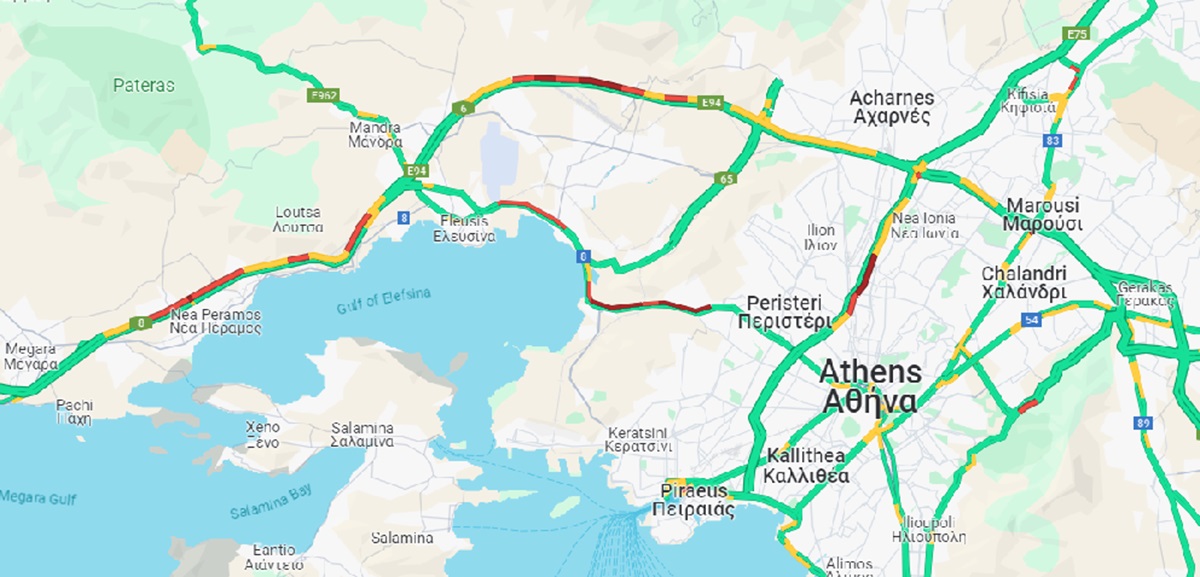 Παράλληλα, κίνηση επικρατεί και στη Λ. Αθηνών, στο ύψος του Χαϊδαρίου αλλά και στην Εθνική Οδό Αθηνών-Κορίνθου, λίγο πριν τα Μέγαρα.