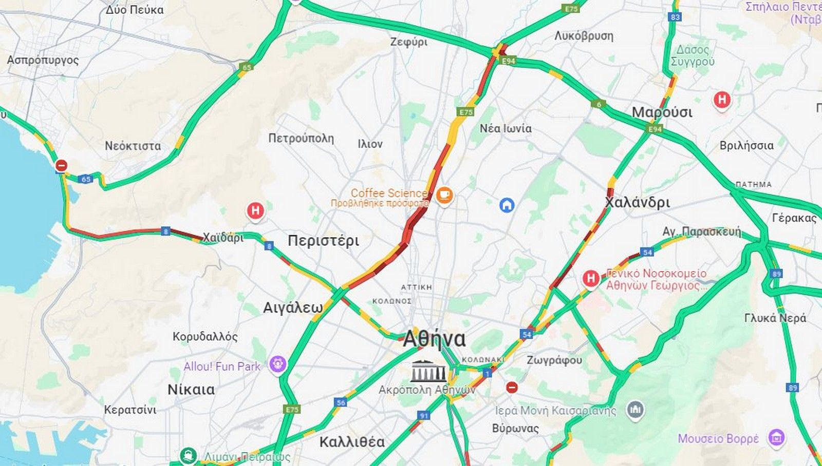 Μεγάλη συμφόρηση υπάρχει στη Λεωφόρο Αθηνών, στο ρεύμα προς Αθήνα, αλλά και στη Λ. Κηφισού, κυρίως στο ρεύμα της ανόδου, στο ύψος του Περιστερίου.