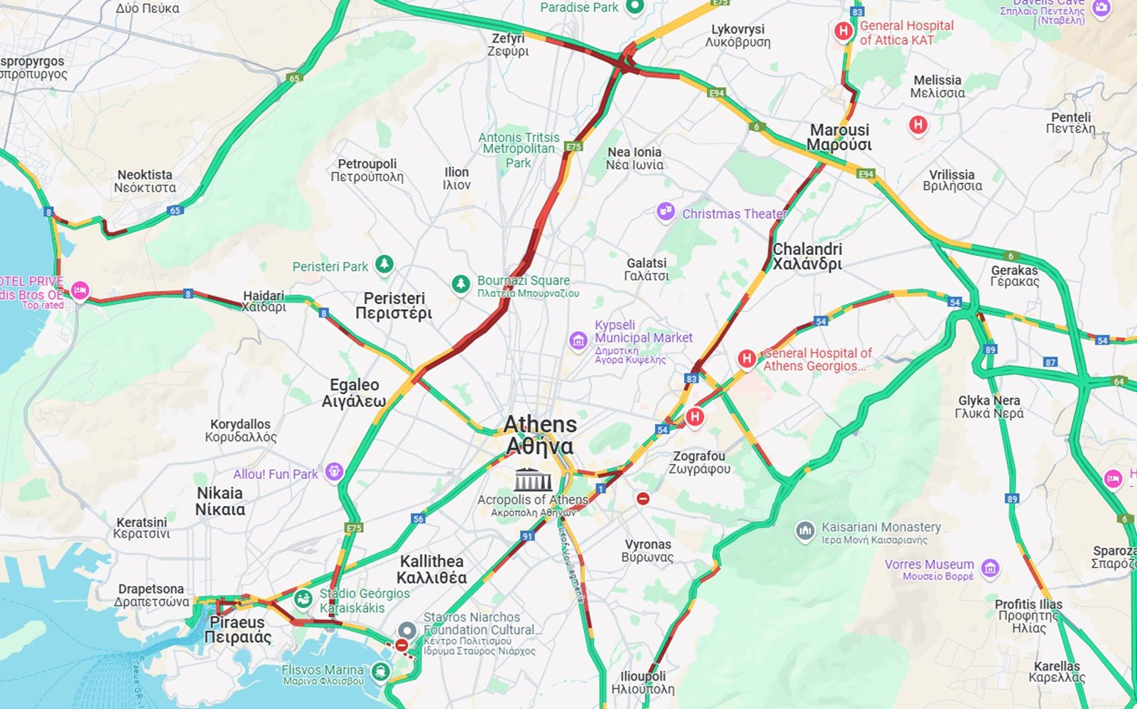 Συμφόρηση παρατηρείται και στην Κηφισίας, κυρίως από την Πανόρμου έως το Ψυχικό στην άνοδο αλλά και στην κάθοδο στο ύψος του Αμαρουσίου.
