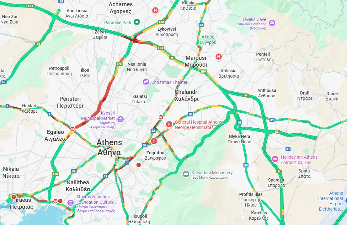 Κόκκινος είναι και στα δύο ρεύματα ο Κηφισός, από το ύψος του Αιγάλεω έως τη Νέα Φιλαδέλφεια, σχηματίζονται ουρές χιλιομέτρων, με τα οχήματα να κινούνται με πολύ αργό ρυθμό.