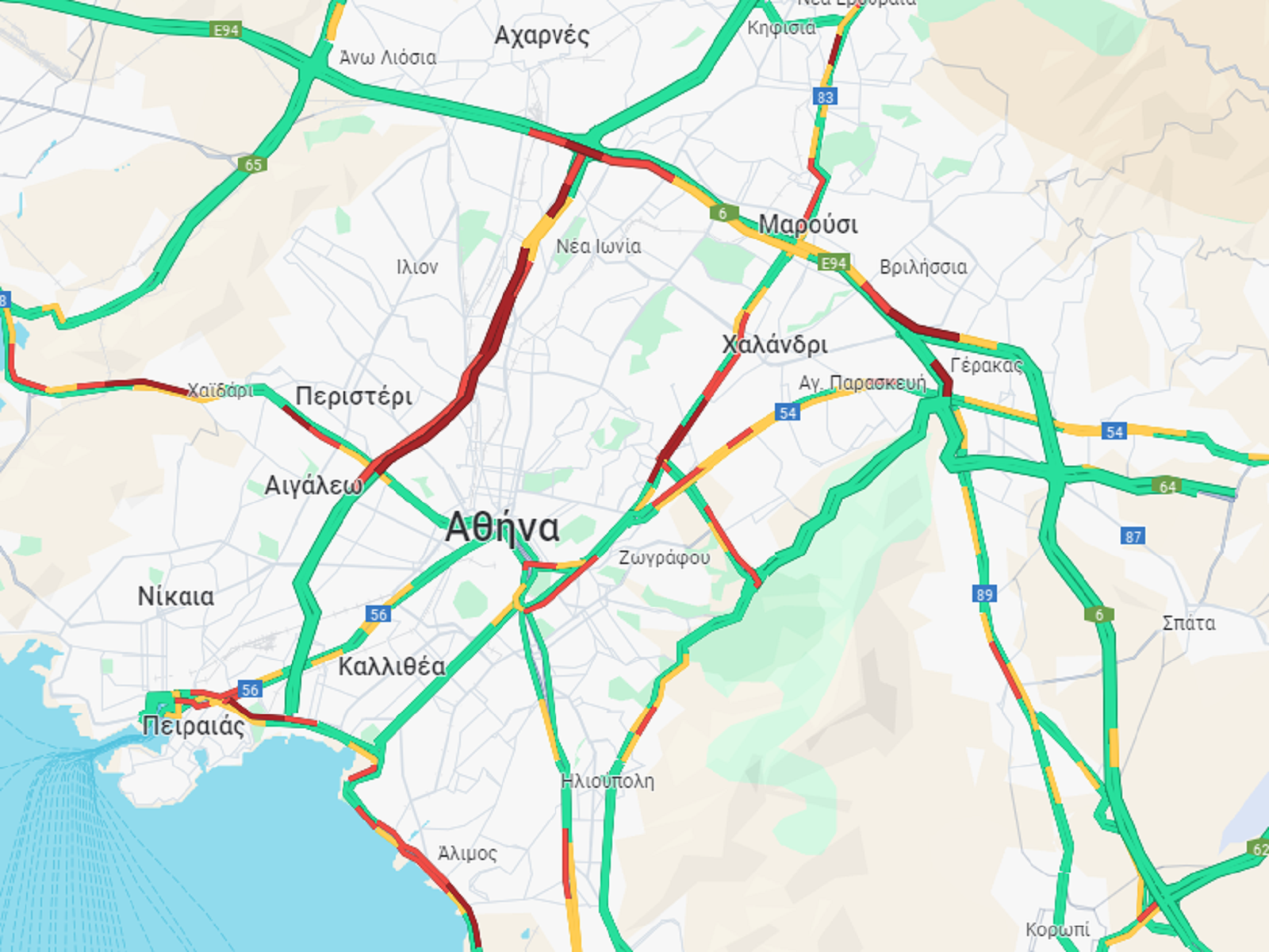 Συγκεκριμένα, αυξημένη είναι η κίνηση στον Κηφισό και στα δύο ρεύματα, από το ύψος της Ιεράς Οδού μέχρι και το ύψος της Νέας Ιωνίας. Προβλήματα σημειώνονται και σε διάφορα τμήματα της Λεωφόρου Κηφισίας όπως και στην παραλιακή, κυρίως στο ρεύμα προς Πειραιά.
