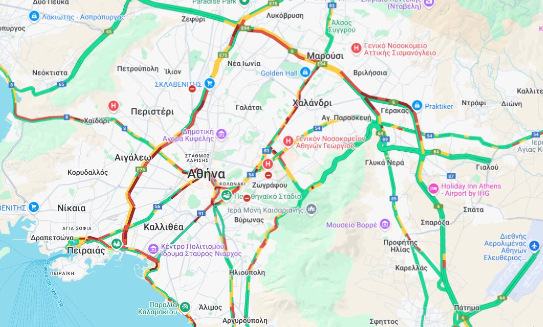Τα μεγαλύτερα προβλήματα εντοπίζονται αυτήν την ώρα στην άνοδο του Κηφισού, από την Λ. Ποσειδώνος έως τη Νέα Φιλαδέλφεια αλλά και στην Αττική Οδό όπου υπάρχουν καθυστερήσεις στο ρεύμα προς Ελευσίνα άνω των 30΄ από κόμβο Κάντζας έως κόμβο Μεταμόρφωσης αλλά και στο ρεύμα προς Αεροδρόμιο 15΄-20΄από κόμβο Μεταμόρφωσης έως κόμβο Πεντέλης.
