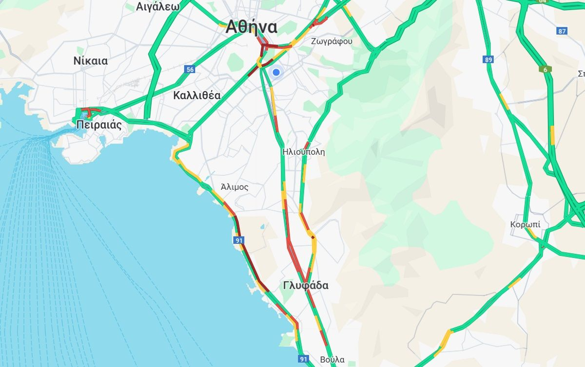 Τα μεγαλύτερα προβλήματα εντοπίζονται, σύμφωνα με επίσημη ενημέρωση από την Τροχαία, στη συμβολή των Λεωφόρων Ποσειδώνος και Γρηγορίου Αυξεντίου, με τα οχήματα να έχουν σχηματίσει ουρές χιλιομέτρων από την παραλία της Γλυφάδας, τη Μαρίνα του Αγίου Κοσμά.