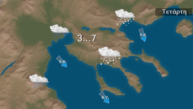 Οι άνεμοι θα πνέουν στα ανατολικά και νότια, νότιοι 6 με 7 και στο Αιγαίο τοπικά 8 μποφόρ και στις υπόλοιπες περιοχές από βόρειες διευθύνσεις 5 με 7 και στο Ιόνιο τοπικά 8 μποφόρ. Η θερμοκρασία θα σημειώσει μικρή πτώση στα δυτικά, τα κεντρικά και τα βόρεια και δεν θα ξεπεράσει στα βόρεια τους 6 με 7 βαθμούς, στα υπόλοιπα ηπειρωτικά και τα νησιά του Ιονίου τους 13 με 14 βαθμούς, ενώ στα νησιά του Αιγαίου θα φτάσει τους 15 με 16 βαθμούς Κελσίου.