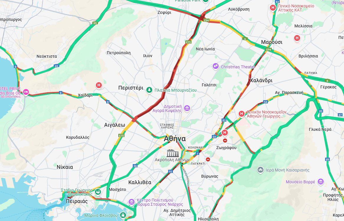 Στο “κόκκινο” είναι και το κέντρο, όπου τα οχήματα κινούνται με χαμηλές ταχύτητες και στα δύο ρεύματα της Λ. Κηφισίας, στην άνοδο και την κάθοδο της της Βασ. Σοφίας, στη Βασ. Κωνσταντίνου και στη Σταδίου.