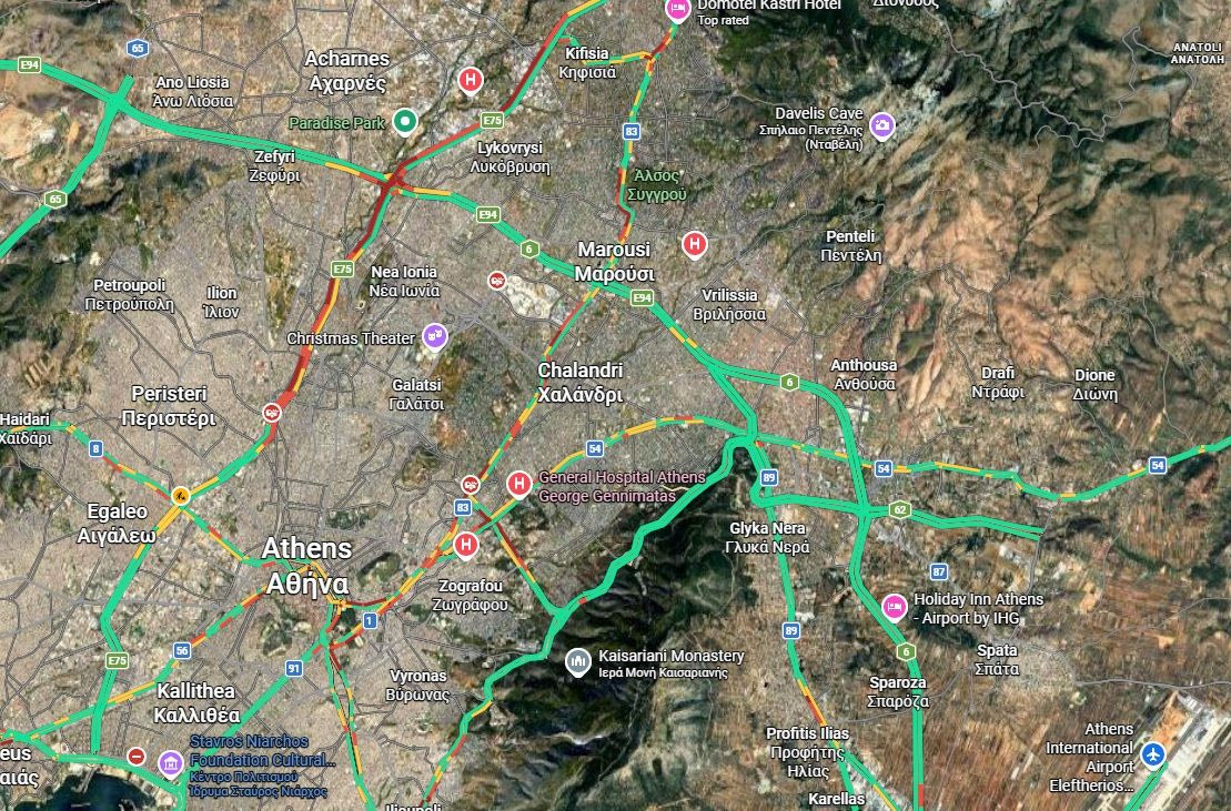 Την ίδια ώρα αυξημένη κίνηση σημειώνεται και σε κεντρικούς δρόμους του λεκανοπεδίου, όπως στη Λ. Βασ. Κωνσταντίνου, στη Βασ. Σοφίας, στην άνοδο της Λ. Συγγρού και στη Λ. Μεσογείων.