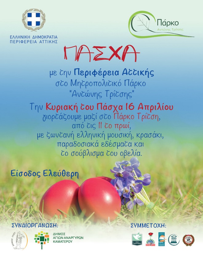 Με μια μεγάλη γιορτή, με παραδοσιακούς χορούς και πασχαλινά εδέσματα διοργανώνει η Περιφέρεια Αττικής στο Μητροπολιτικό Πάρκο "Αντώνης Τρίτσης". Η είσοδος είναι ελεύθερη για όλους τους πολίτες.